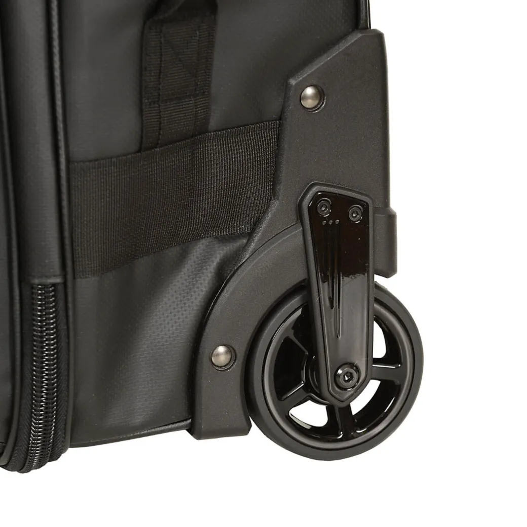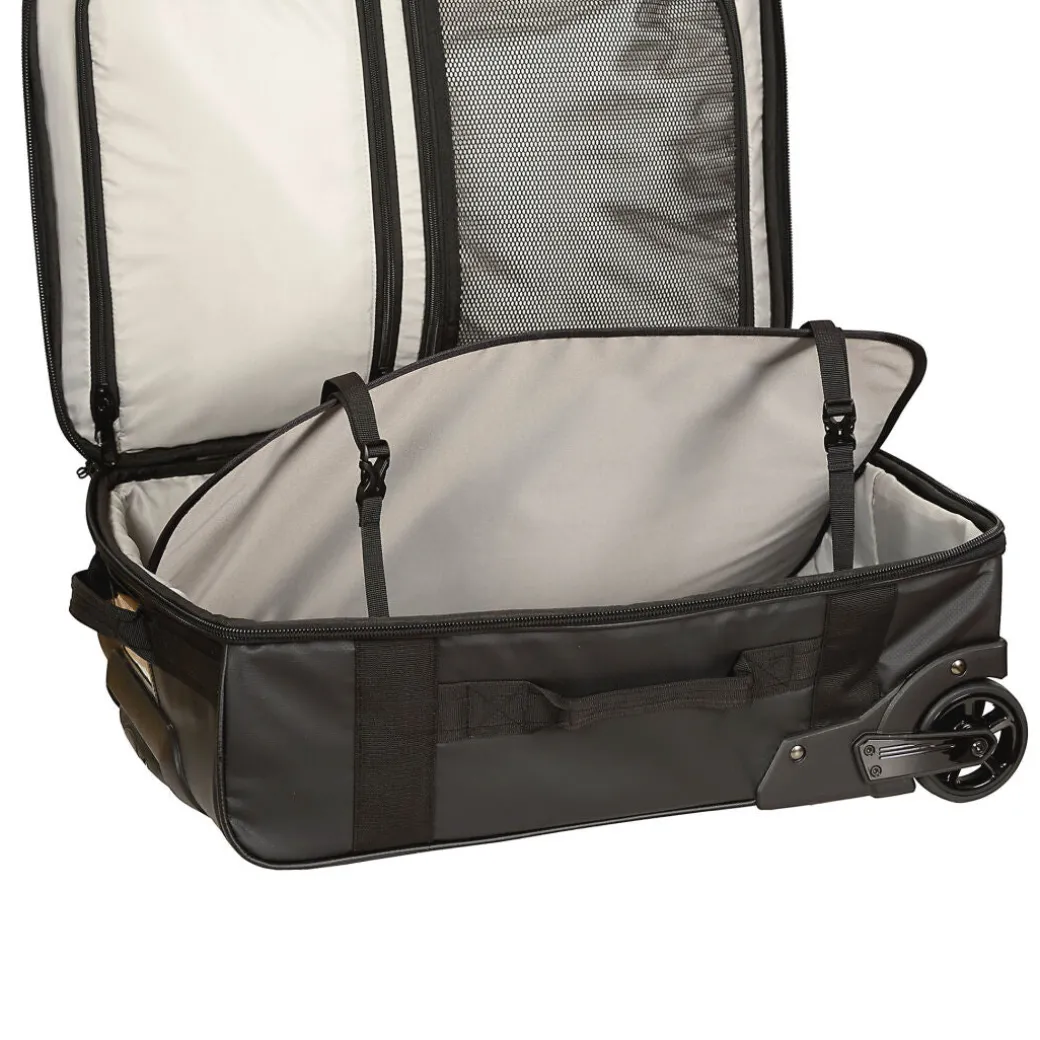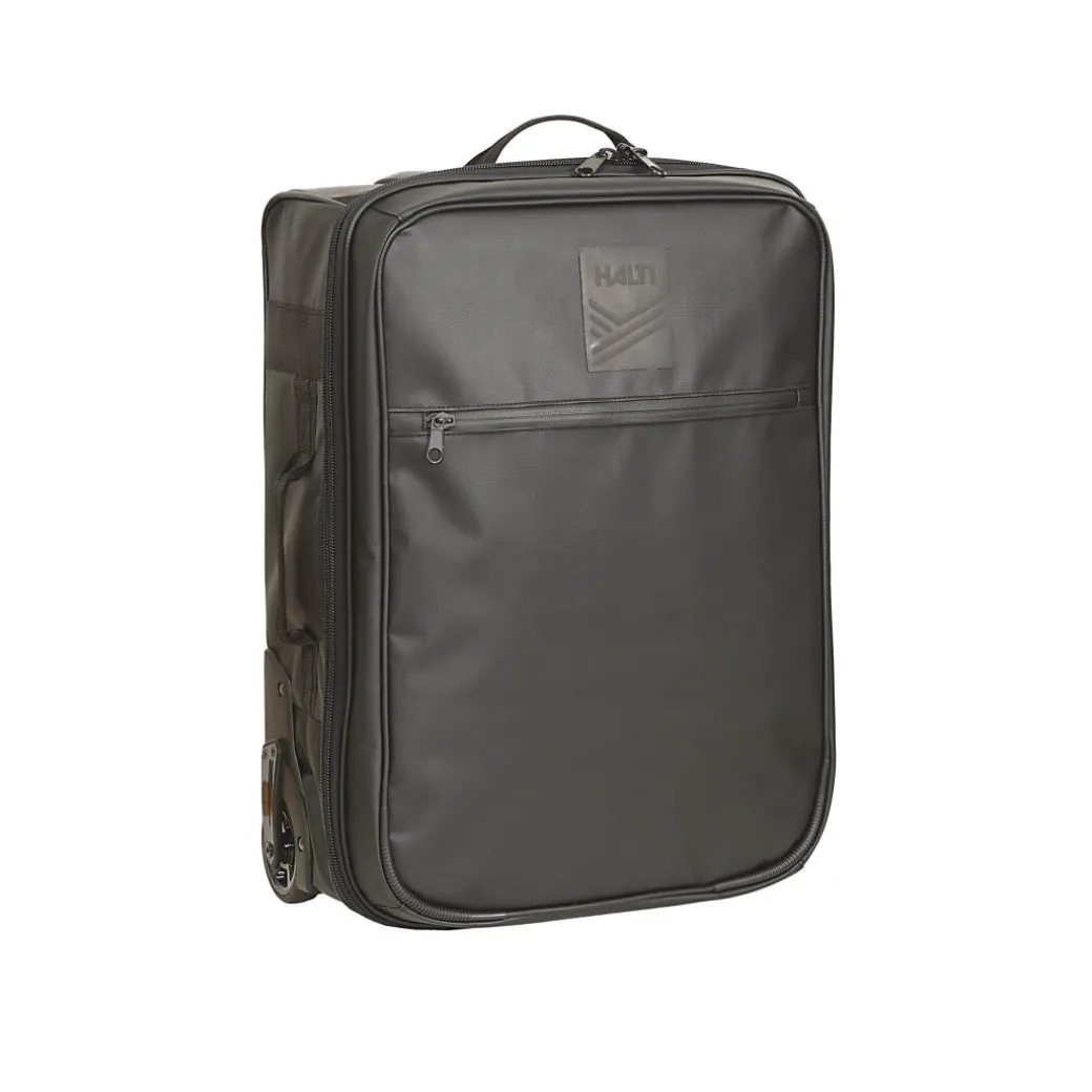 Selkeä ja kevyt vetolaukku, joka koonsa puolesta sopii käsimatkatavaraksi lentokoneeseen.
