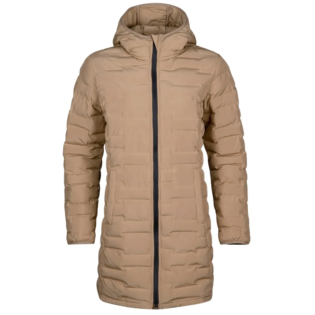 Naisten plusmitoitettu takki untuvan kaltaisella vanulla. Tämä pidempi helmainen takki sopii jokapäiväiseen käyttöön syksyn ja alkutalven kylmeneviin päiviin.